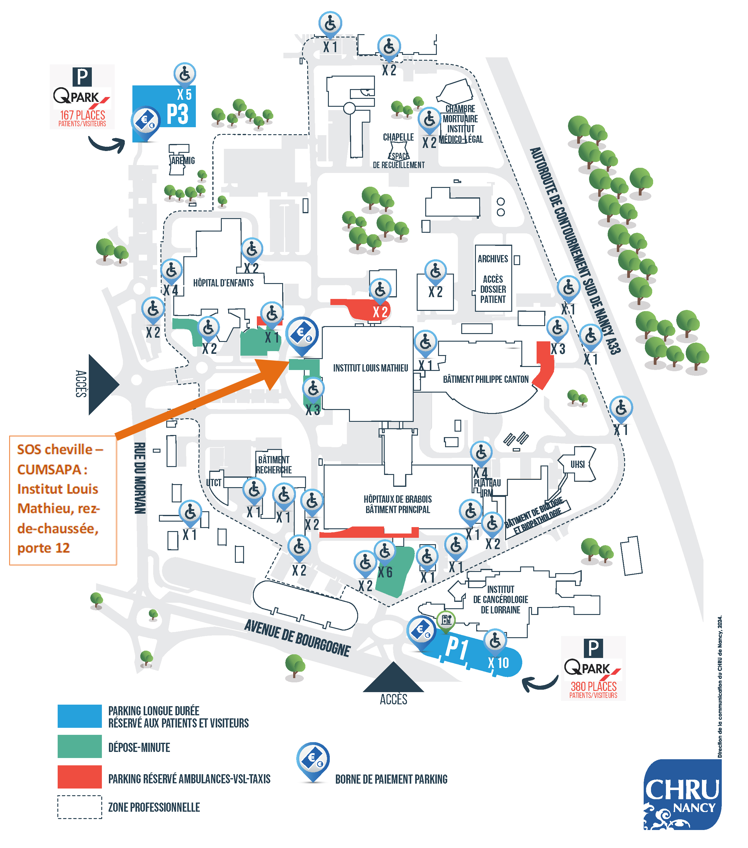 - Parkings réservés aux patients et visiteurs (payants) : P1 et P3 (voir le plan)